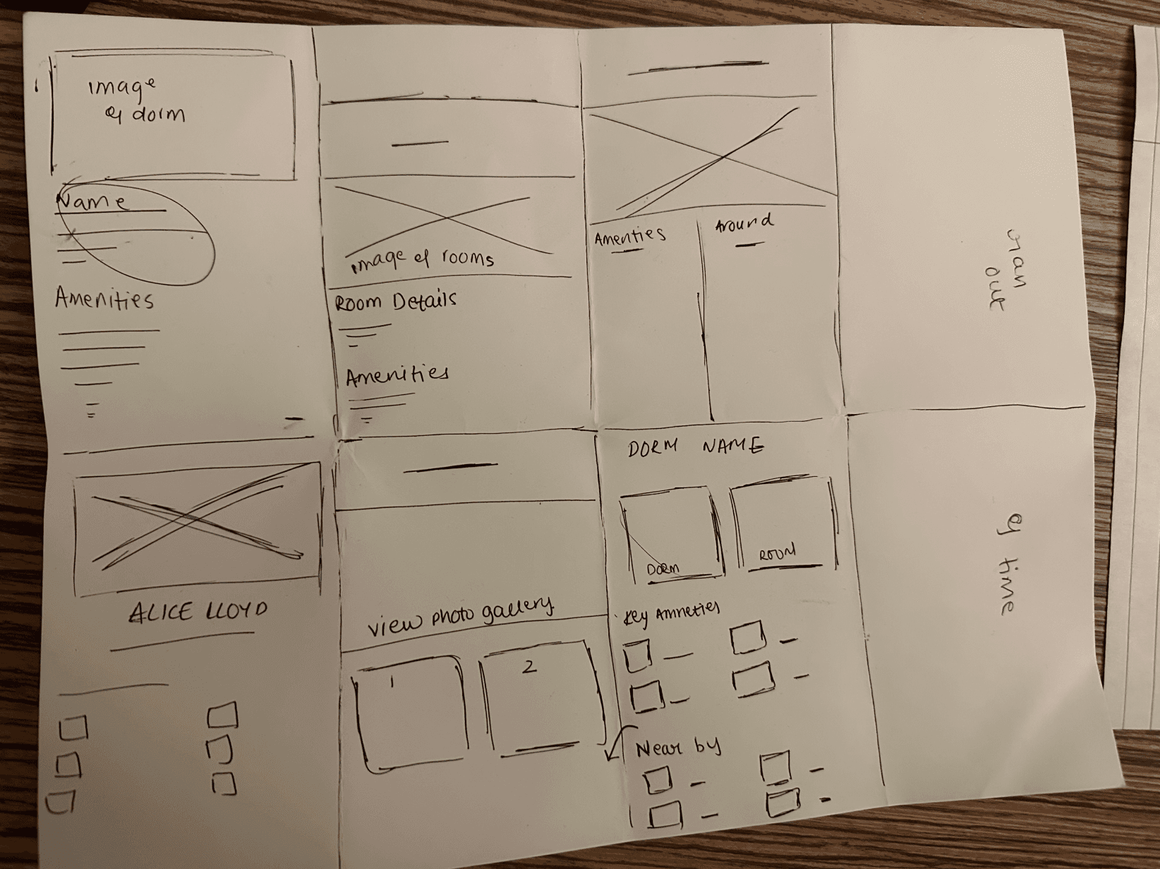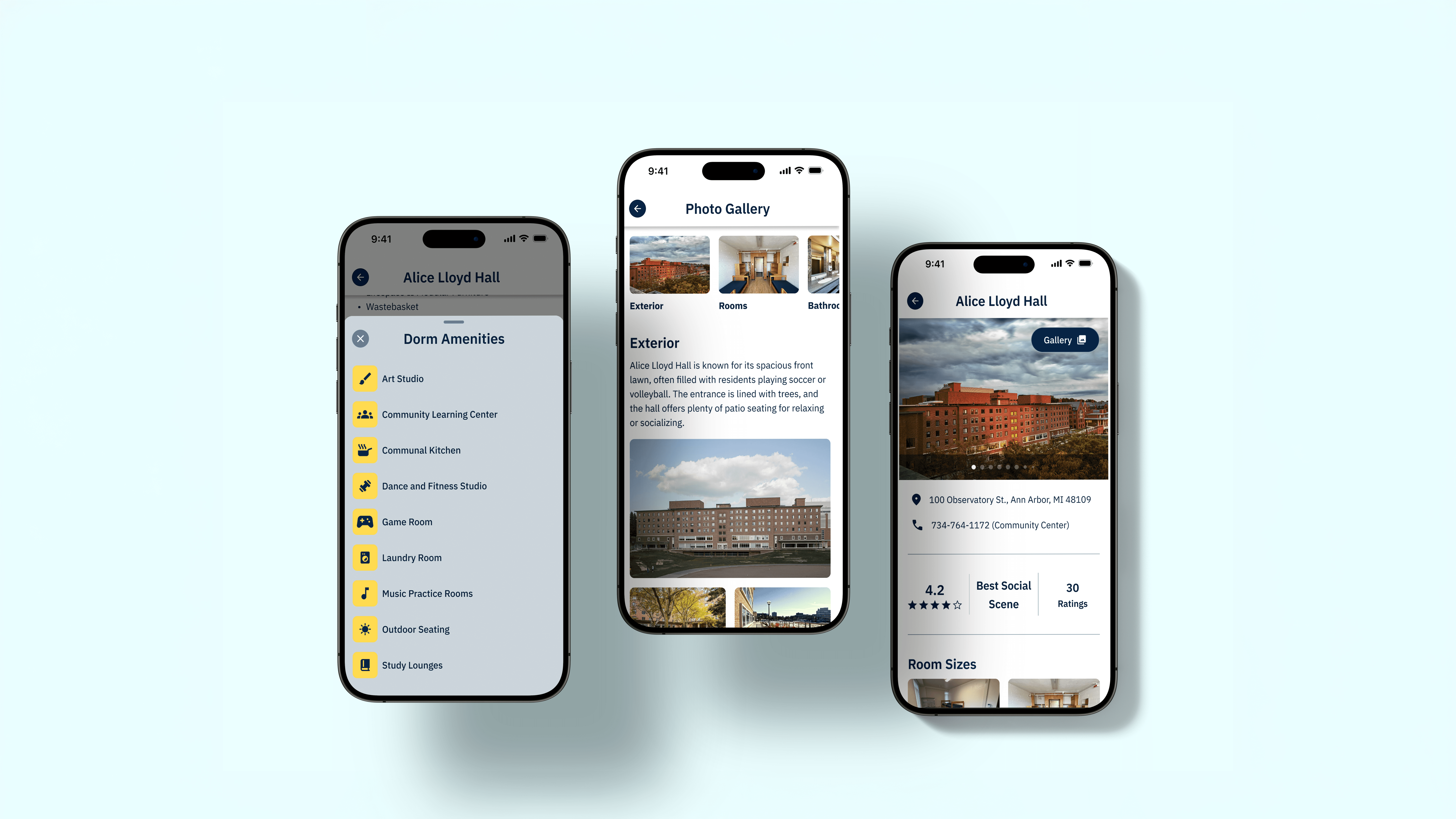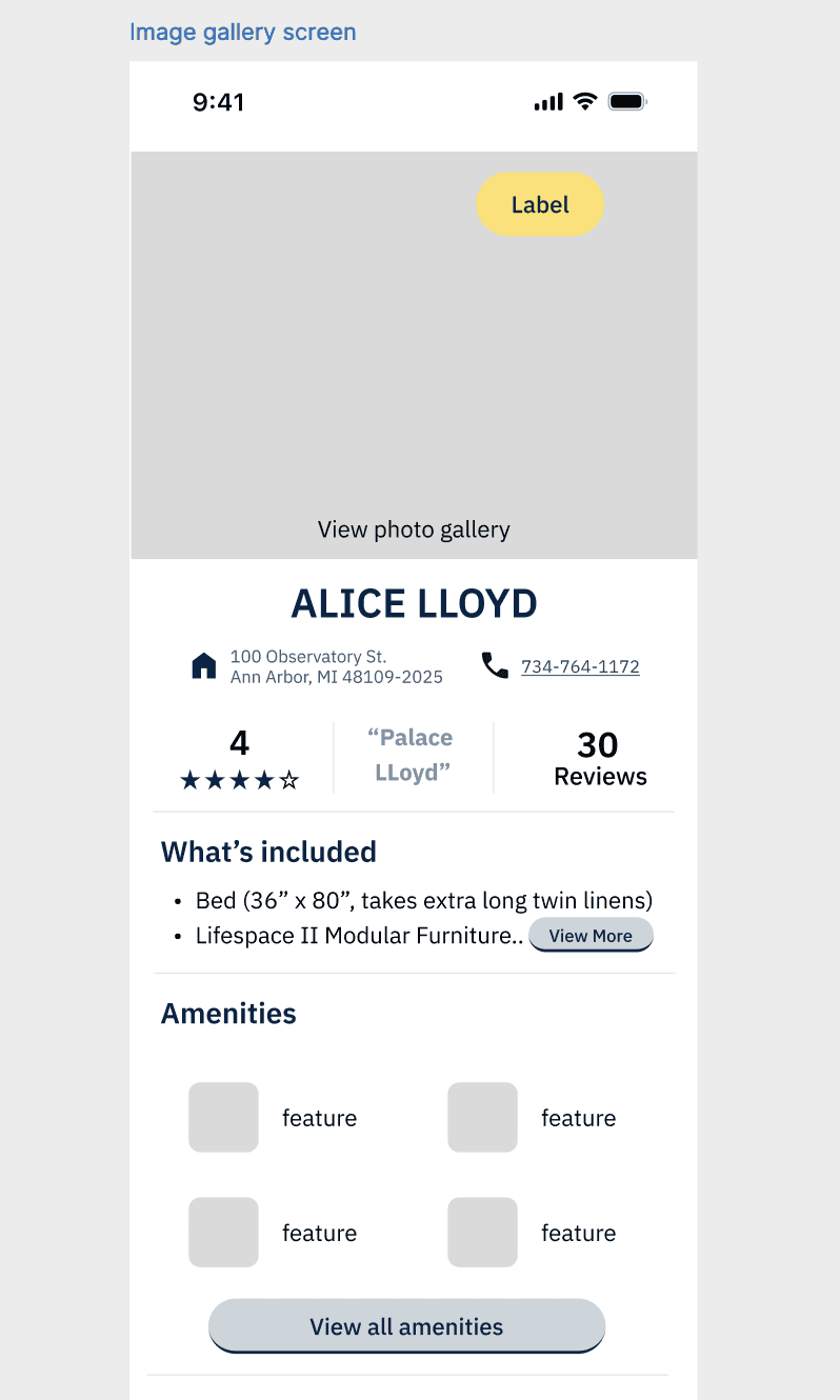 Reviewing our sketches revealed that visual details are the most engaging and useful to students. This led us to adopt a photo-first design for dorm detail screens.