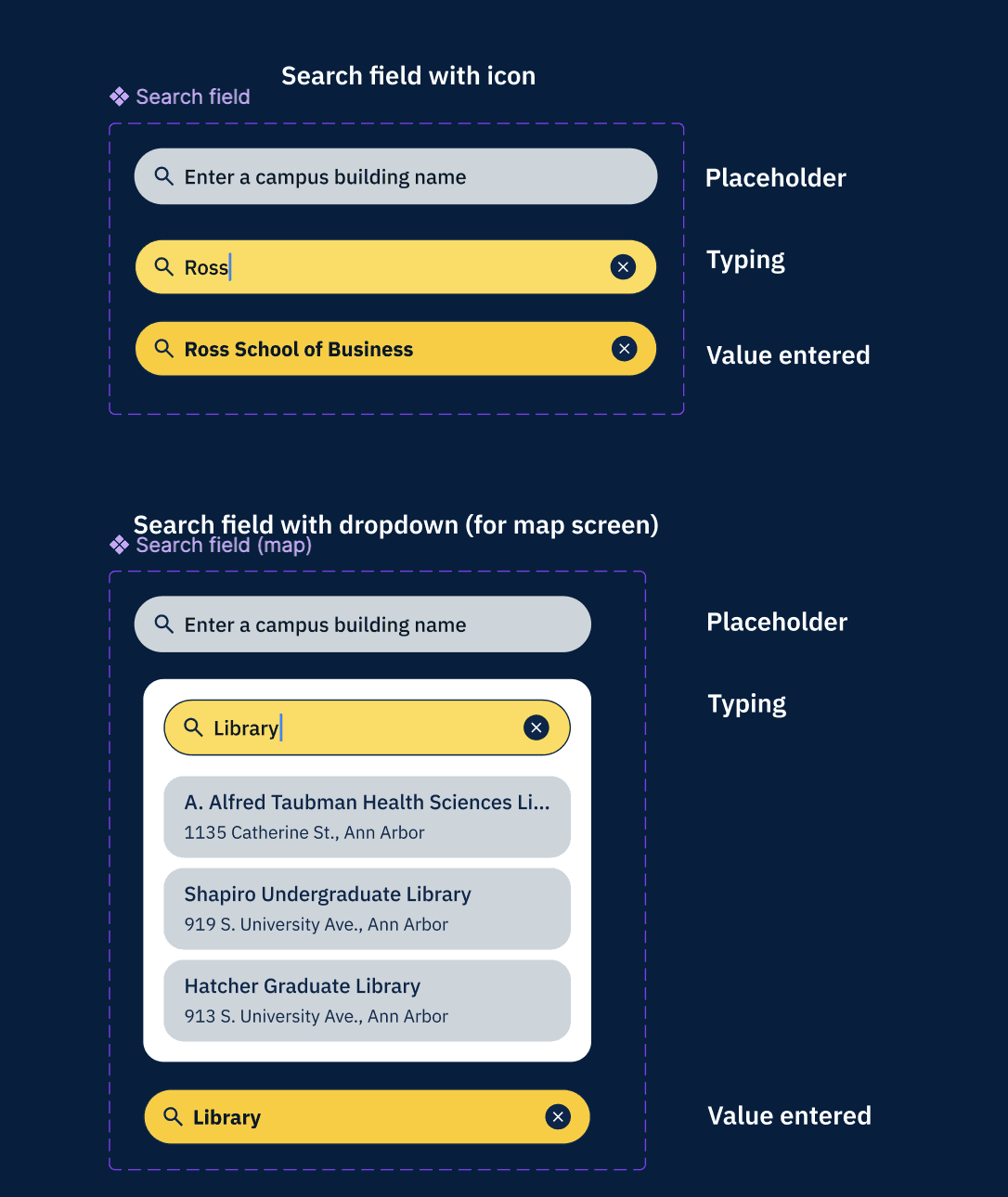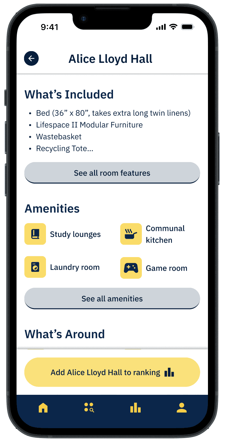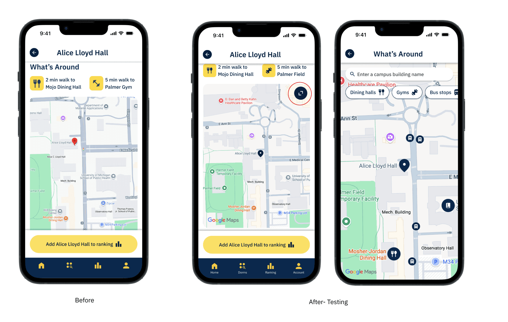 Desire for more functionality out of dorm maps → Allowed users to explore nearby campus buildings and see dorm-to-building distance estimates, following map conventions like location filters, search bars, and pinch-to-zoom gesture.
