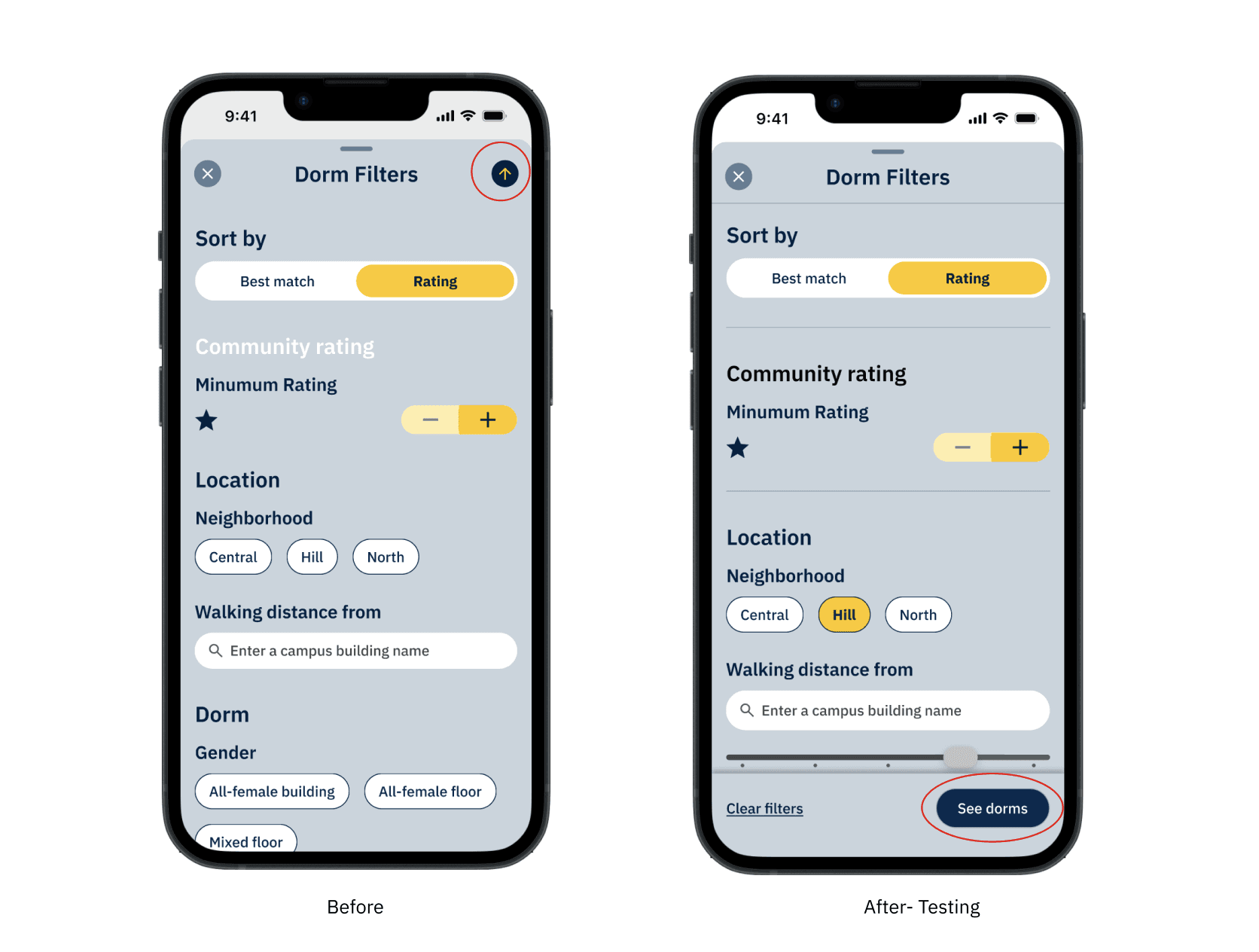 Users were confused about how dorm filters were applied. Three out of five participants expected a visible “Done” or “Search” button and did not recognize the iOS up-arrow as the action to apply filters.