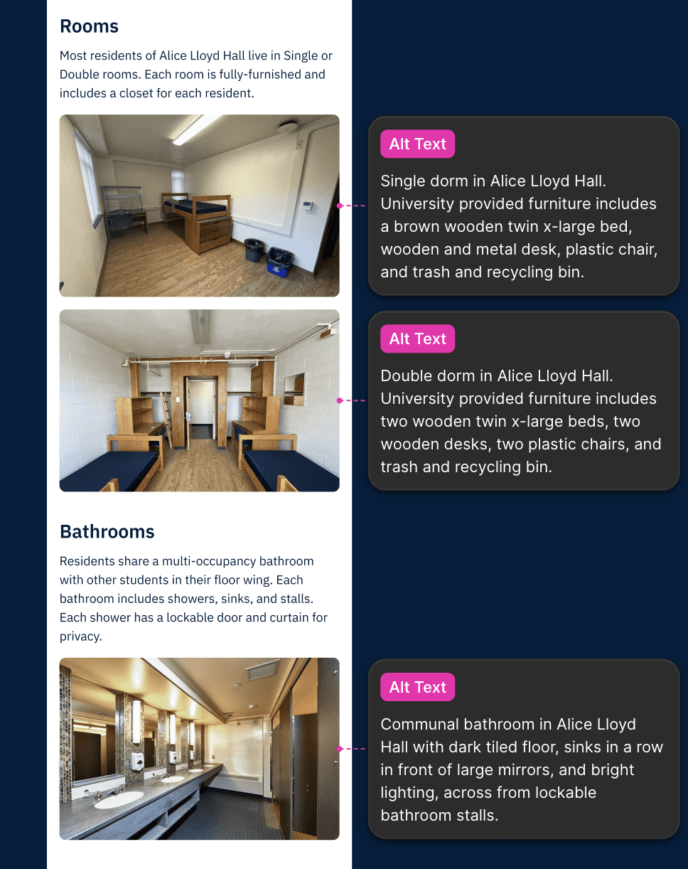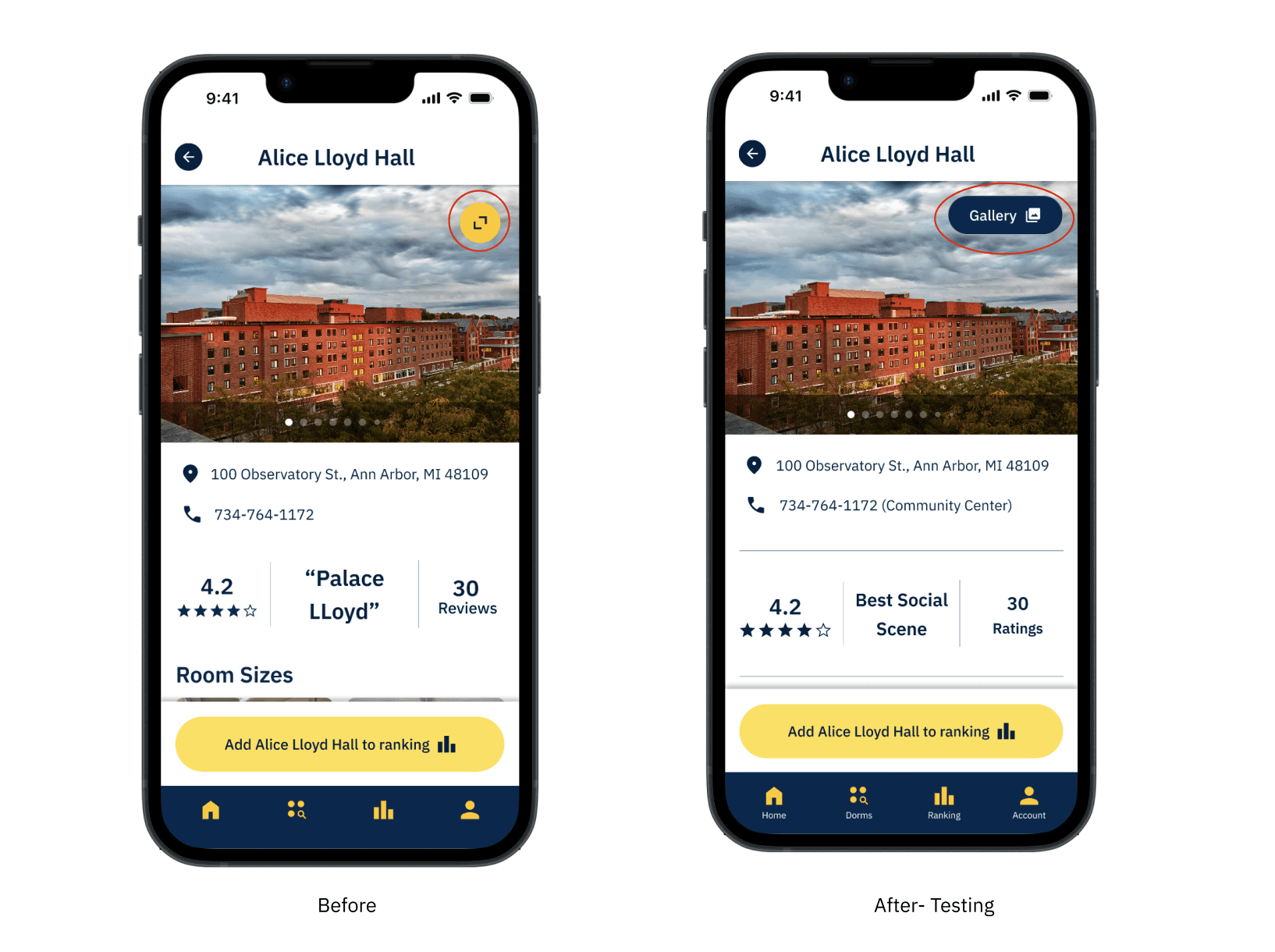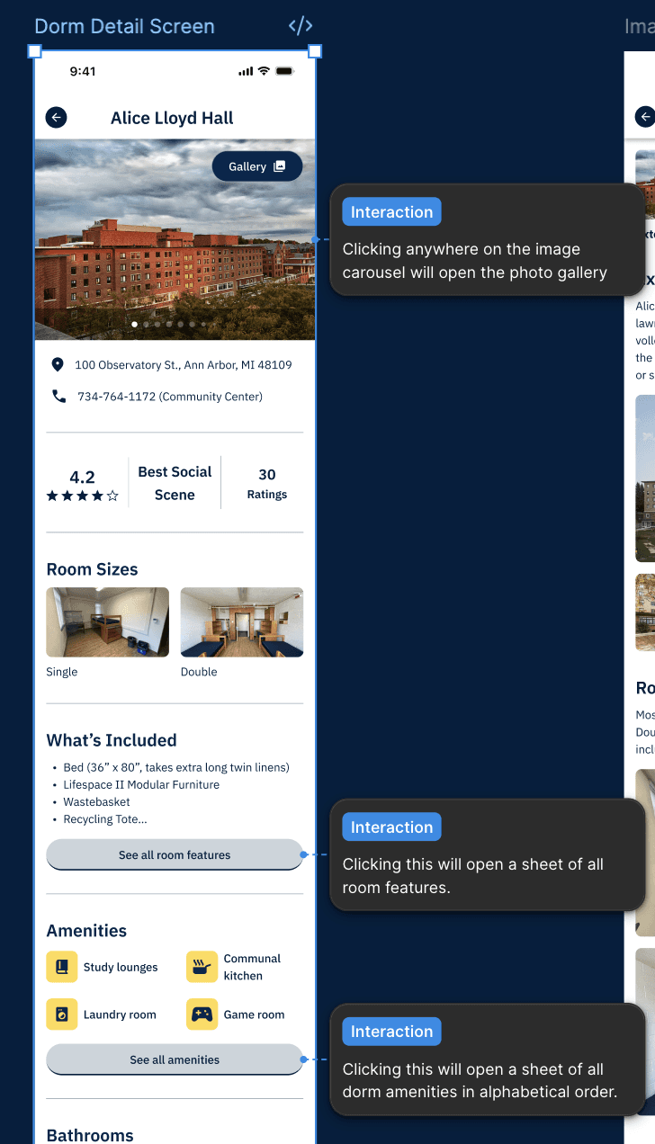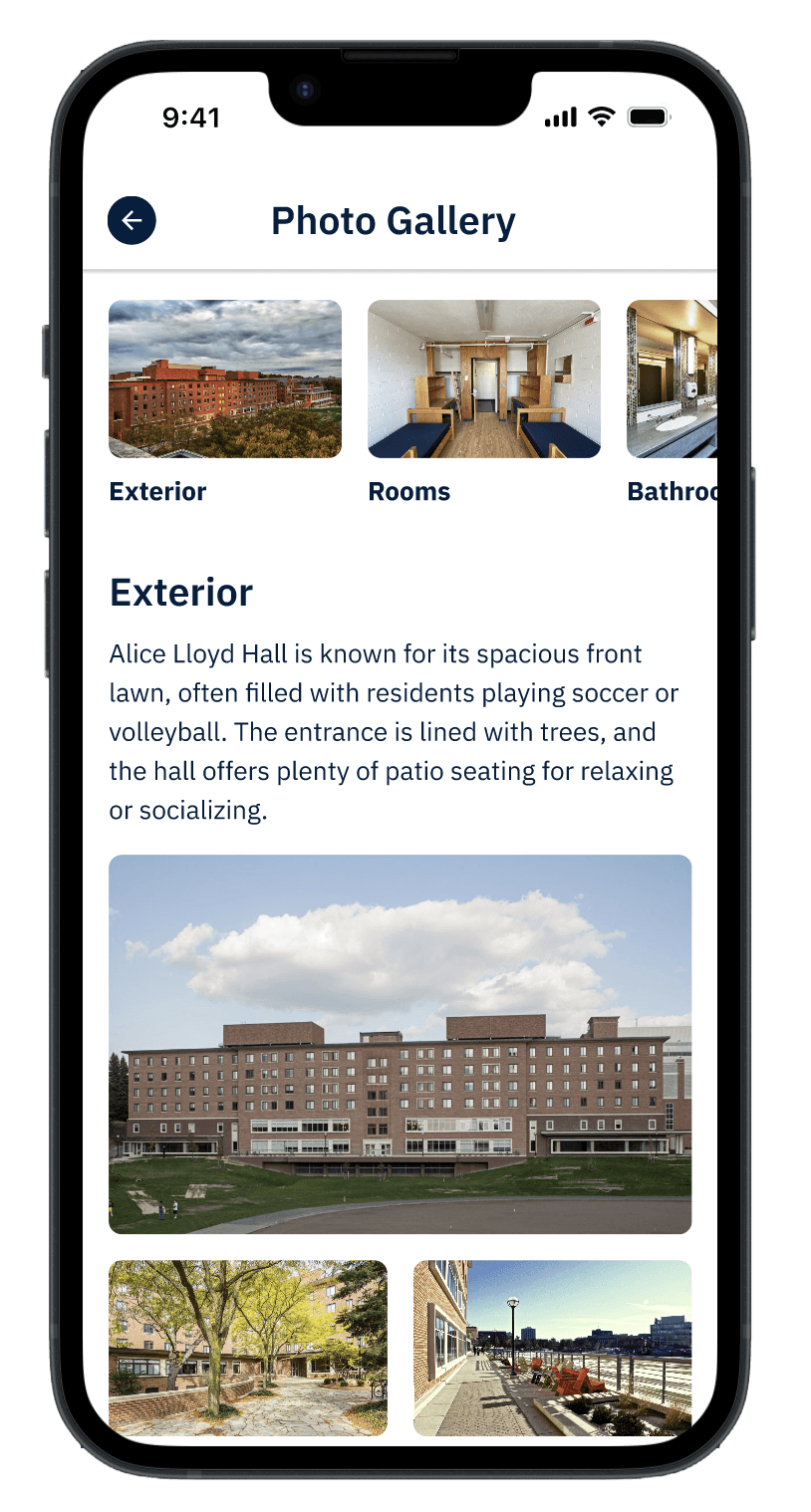 We focused on increasing visual transparency to help students feel more confident in their choices by placing a photo gallery at the top of each dorm page that opens into a collection of student-submitted photos showing real rooms, shared spaces, and amenities to give a clearer and more trustworthy view of dorm life.