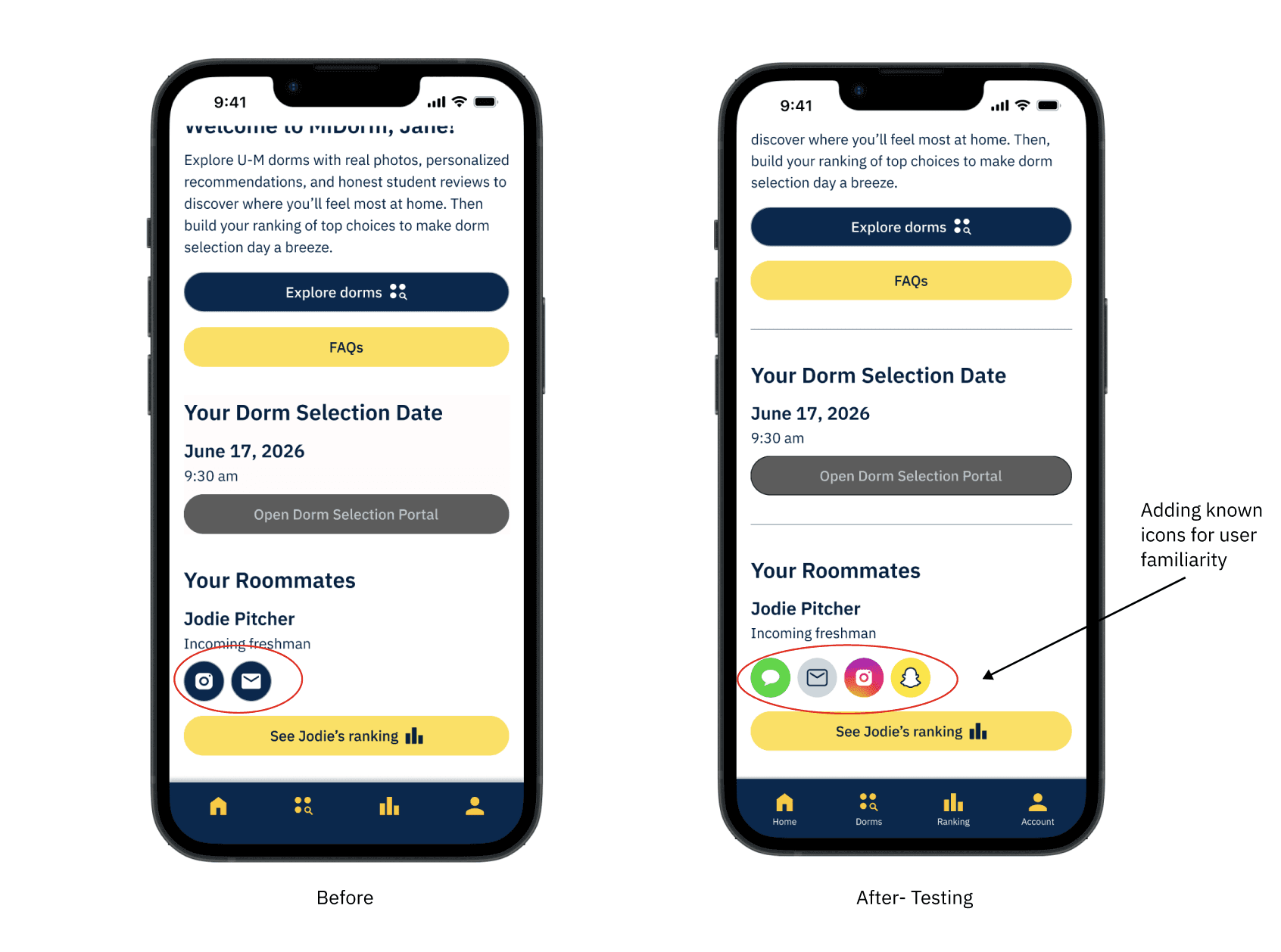 We conducted 5 moderated usability tests with current undergraduate U-M students who have previously lived in a campus dorm. This testing population was chosen as it closely aligned with our target demographic.