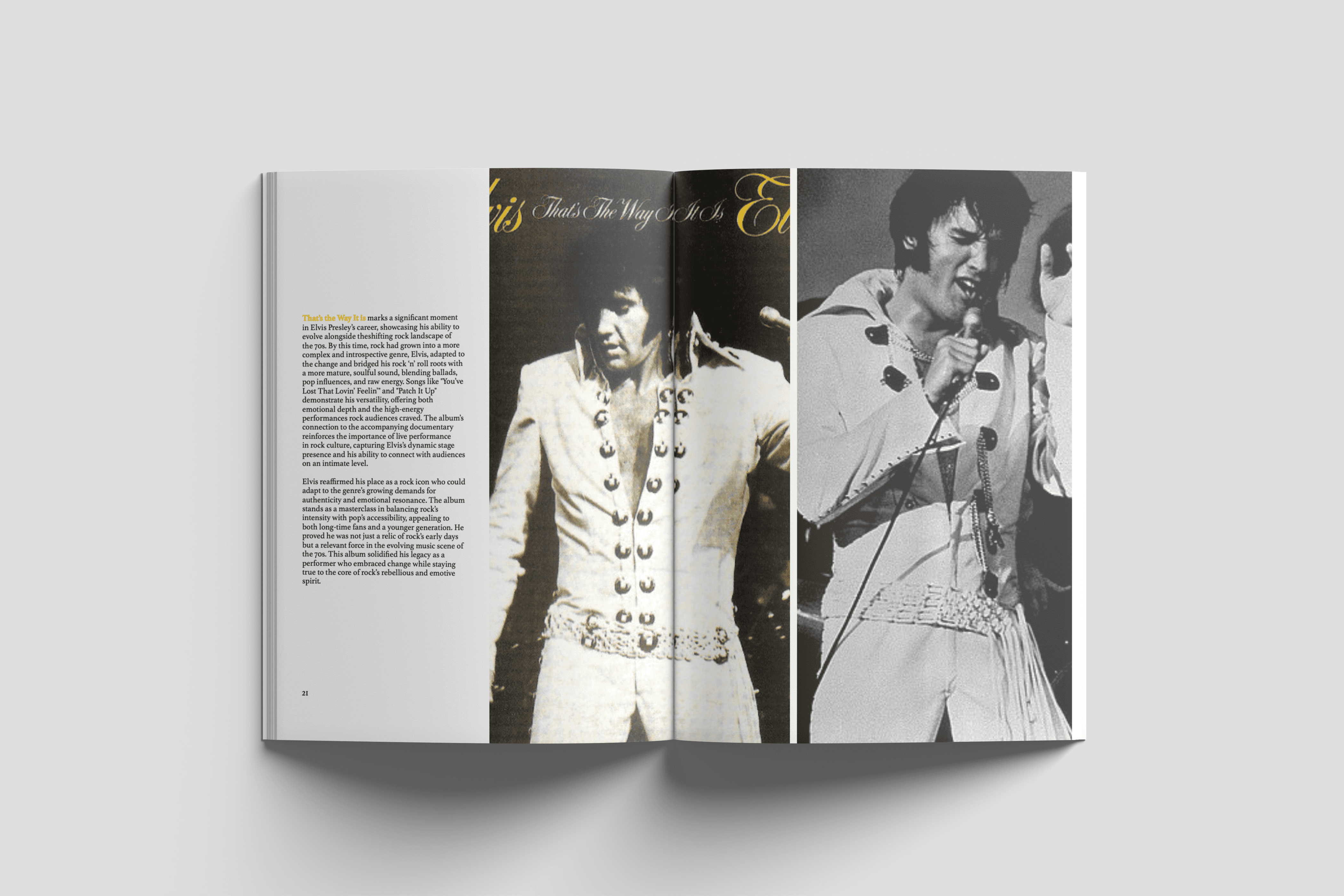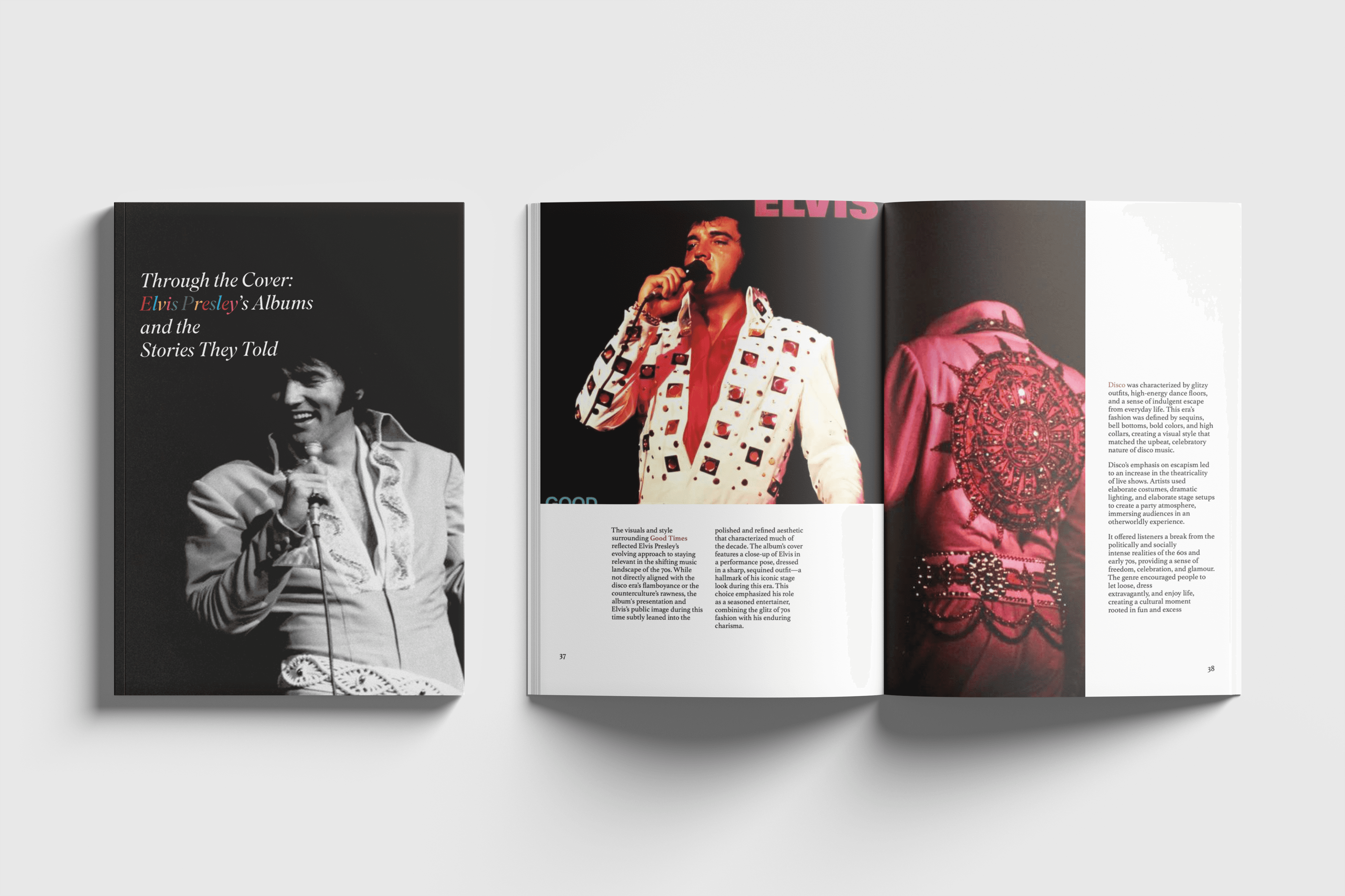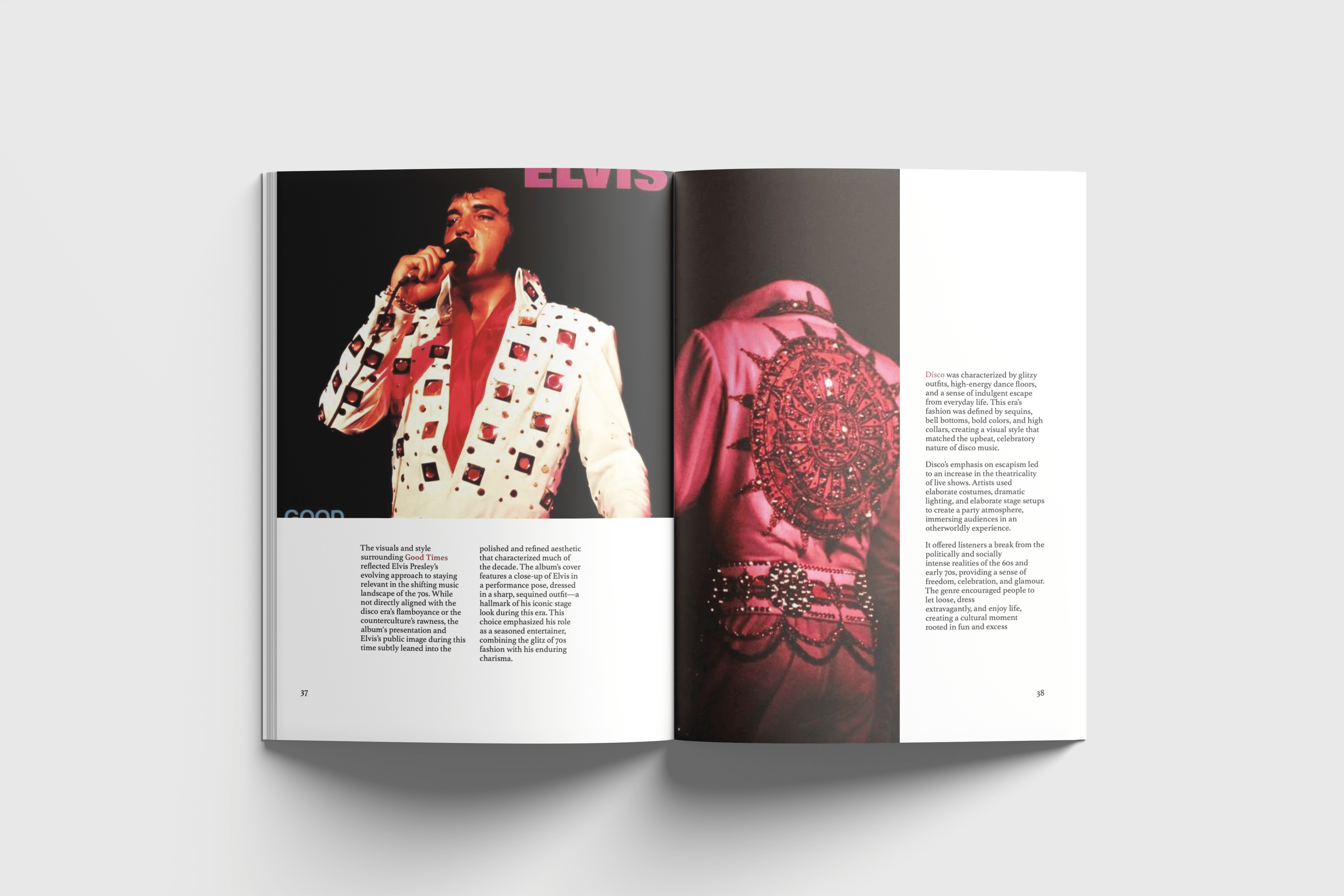 This project follows the journey of Elvis Presley and his music albums through the 70s and the stories behind the albums. His 1970s albums are divided into four categories to highlight the different phases he went through. As the 1970s marked the final years of his studio albums, this publication showcases the range of work he created during this period and how each album contributed to his overall story.