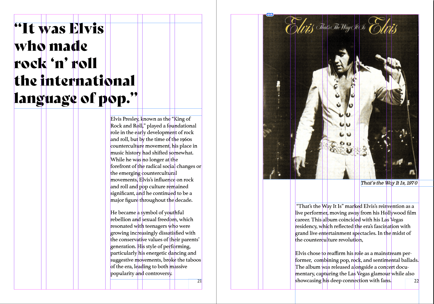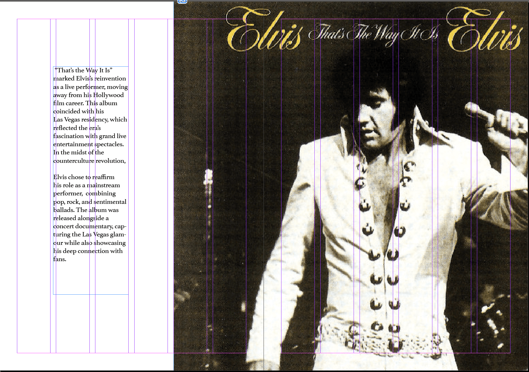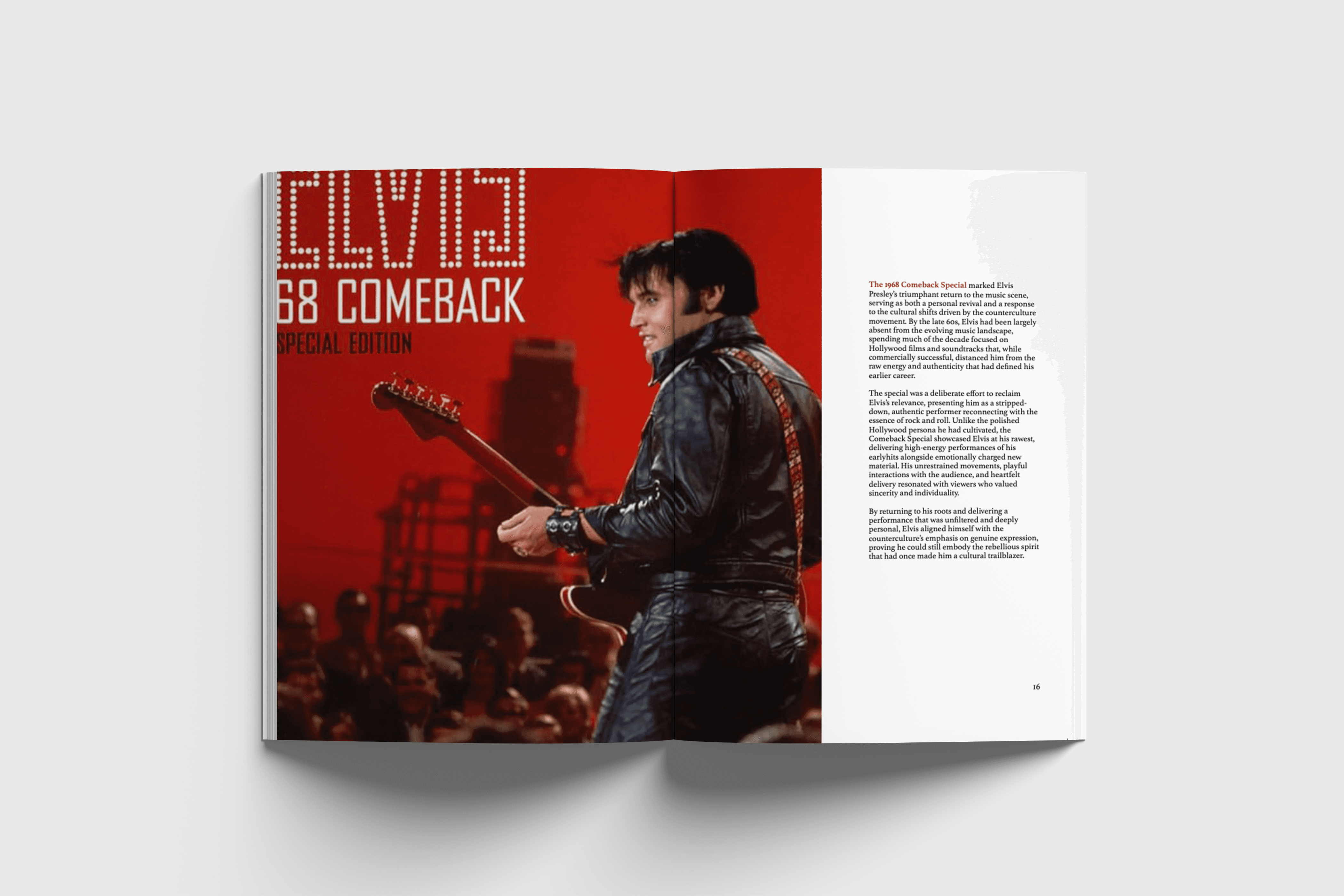 This project follows the journey of Elvis Presley and his music albums through the 70s and the stories behind the albums. His 1970s albums are divided into four categories to highlight the different phases he went through. As the 1970s marked the final years of his studio albums, this publication showcases the range of work he created during this period and how each album contributed to his overall story.